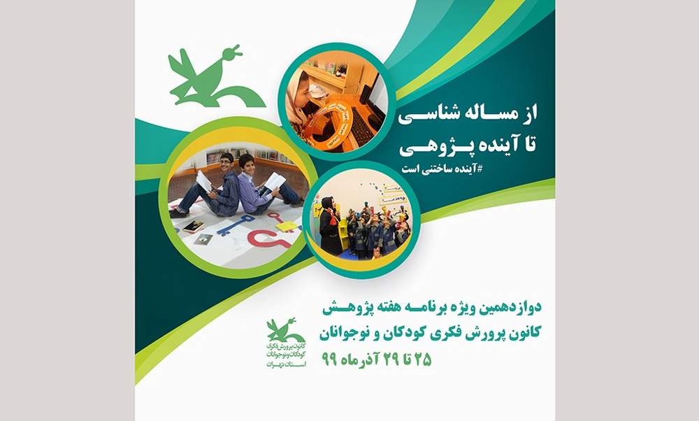 به گزارش روابط عمومی اداره کل کانون پرورش فکری کودکان و نوجوانان استان تهران فاطمه تنهایی با اشاره به اینکه پرورش روحیه ی کاوشگری، مشاهده گری، پرسشگری وجستجوگری باید از دوران کودکی آغاز شود وگسترش فرهنگ پژوهش در بین کودکان و نوجوانان نیازمند آموزش مهارت های پژوهشی به آنان است افزود : دوازدهمین هفته پژوهش کانون پرورش فکری کودکان ونوجوانان استان تهران با شعار «از مساله‌شناسی تا آینده پژوهی (آینده ساختنی‌ است)» ۲۵ تا ۲۹ آذر ۱۳۹۹ درپنج عنوان برگزار می شود.
