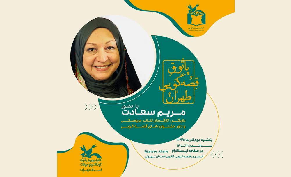 اولین نشست "پاتوق قصه گویی طهران" با حضور "مریم سعادت" بازیگر سینما و تلویزیون، کارگردان تئاتر عروسکی و داور جشنواره های قصه گویی به صورت برخط و تصویری در فضای مجازی برگزار شد.