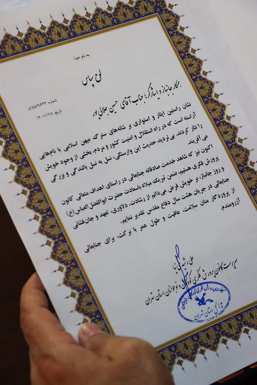 به گزارش روابط عمومی اداره کل کانون پرورش فکری استان تهران؛ علی رشیدی نیا همزمان با ولادت حضرت ابوالفضل العباس (ع) و روز جانباز از حسین جلالی پور با اهدای لوح و هدیه تقدیر به عمل آورد.